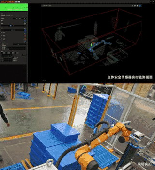 以機器人碼垛工作站為例,現場為人機協作場景,除了有傳統的安全防護(例如光柵)外,還需要檢測場景內是否有人員存在,防止設備意外開機后人員傷害。通過部署灣測立體安全傳感器,可以實現無感的實時防護,最大限度保障現場作業人員安全,保證生產效率。