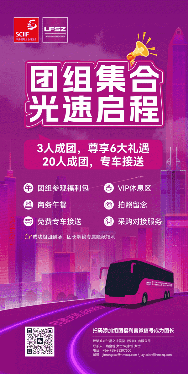 為回饋廣大觀眾長期以來的支持,2025深圳激光展精心籌備了專屬福利。在2025年6月2日18:00前完成預登記,您就能在展會現場領取咖啡券、地鐵票,還有一份神秘禮物。不僅如此,預登記組團還有額外驚喜:邀請3人,團長可獲LED護眼臺燈;邀請5人,能得定制雨傘;邀請10人,更有定制背包奉上。若組團人數達到20人,團隊將尊享六大福利,包括參觀福利包、商務午餐、免費專車接送、專屬觀眾休息區、團體拍照留念,以及采購對接服務。別再猶豫,立即預登記,率先開啟這場充滿驚喜與機遇的激光行業精彩之旅!